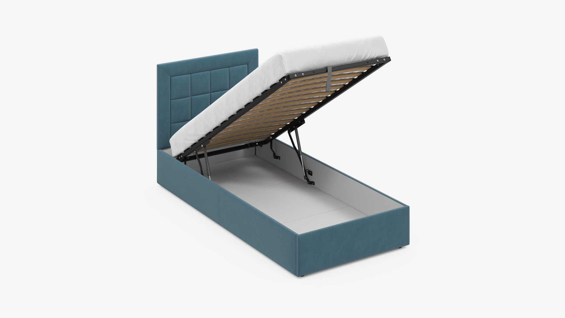 Вместительная емкость под кроватью без внутренних перегородок позволяет использовать для хранения вещей 100% пространства.