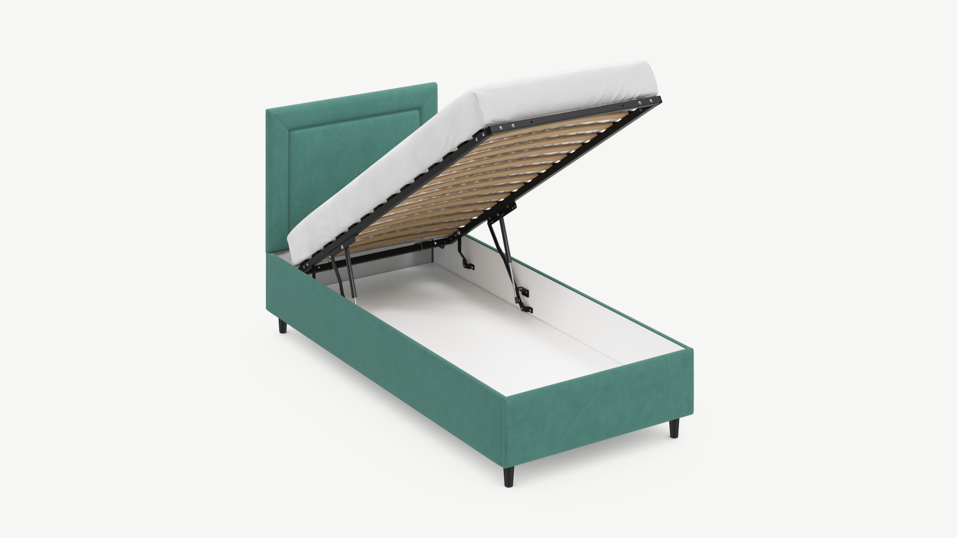 • Скрытая под основанием вместительная емкость без внутренних перегородок позволяет использовать всю площадь подкроватного пространства для хранения вещей.