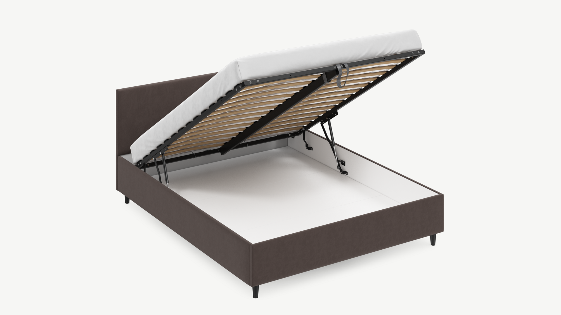 • Скрытая под основанием вместительная емкость без внутренних перегородок позволяет использовать всю площадь подкроватного пространства для хранения вещей.