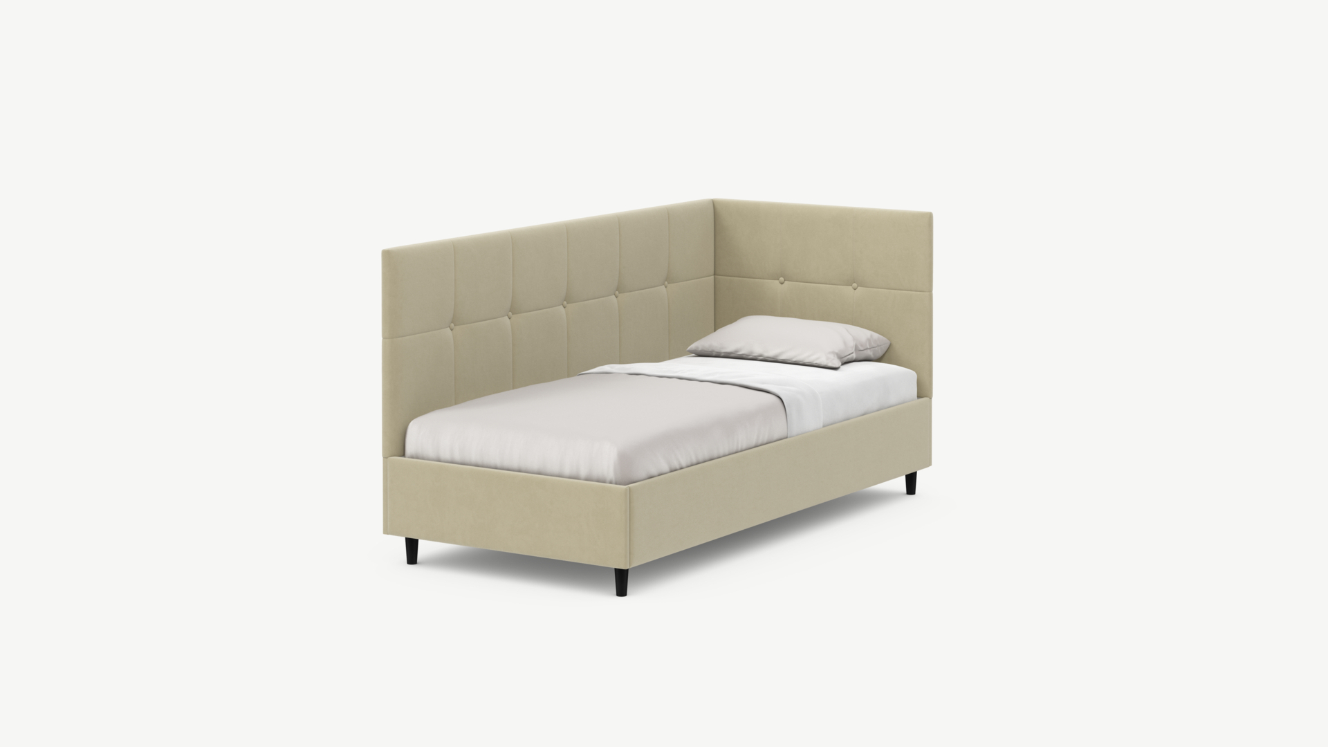 Угловая односпальная кровать MOON FAMILY 1261 с мягкой спинкой и изголовьем создаст в Вашей спальне ощущение уюта. Крупная квадратная стежка привносит в интерьер графических акцентов, а вставка из пуговиц наполняет пространство ощущением домашнего тепла.