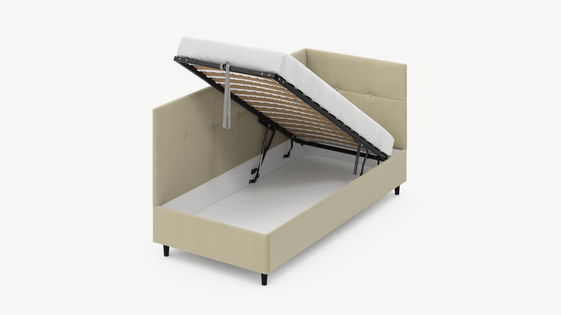 • Скрытая под основанием вместительная емкость без внутренних перегородок позволяет использовать всю площадь подкроватного пространства для хранения вещей.