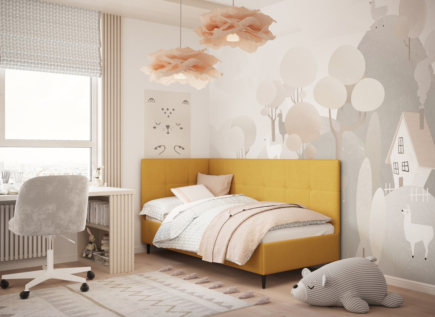 Угловая односпальная кровать MOON FAMILY 1261 с мягкой спинкой и изголовьем создаст в Вашей спальне ощущение уюта. Крупная квадратная стежка привносит в интерьер графических акцентов, а вставка из пуговиц наполняет пространство ощущением домашнего тепла.