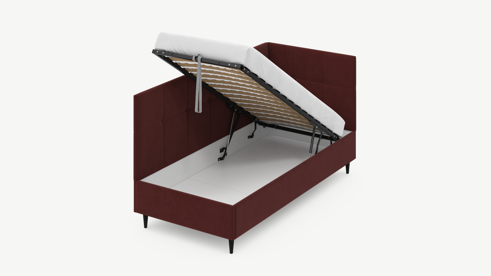 • Скрытая под основанием вместительная емкость без внутренних перегородок позволяет использовать всю площадь подкроватного пространства для хранения вещей.