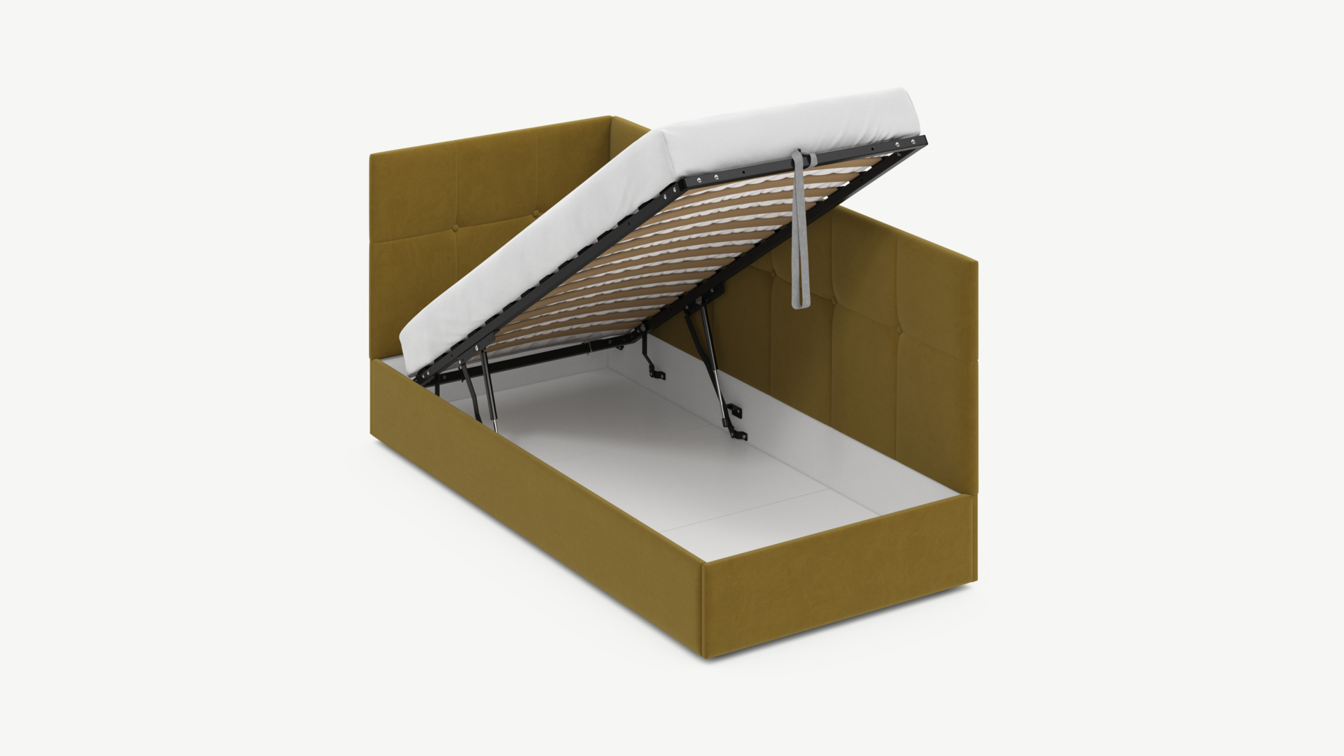Угловая односпальная кровать MOON FAMILY 1261 с мягкой спинкой и изголовьем создаст в Вашей спальне ощущение уюта. Крупная квадратная стежка привносит в интерьер графических акцентов, а вставка из пуговиц наполняет пространство ощущением домашнего тепла.