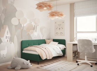 Угловая односпальная кровать MOON FAMILY 1253 с мягкой спинкой и изголовьем обладает округлыми формами, привносящими в интерьер нотки нежности. Изголовье, украшенное пуговицами, добавляет окружающему пространству шарм и уют. Высокие опоры придают кровати визуальной легкости, а также обеспечивают удобство во время уборки.