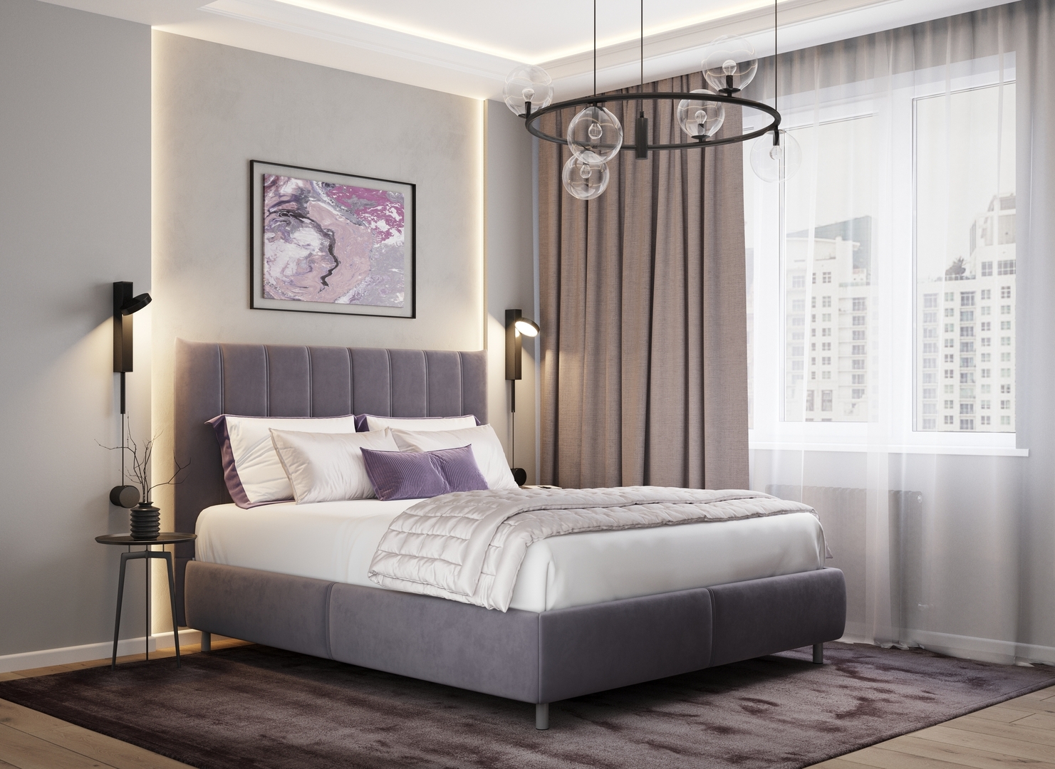 Творчески завершить образ спальни помогут дополнительные аксессуары: декоративные подушки и тумбы.