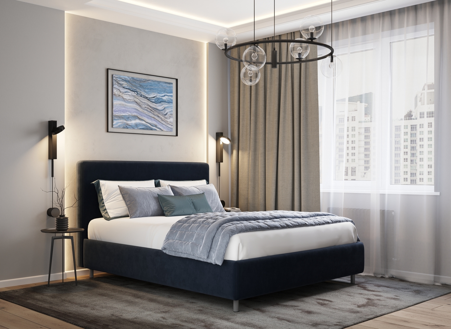 Творческий подход к выбору обивочного материала меняет образ дизайна. Велюр за счет своей бархатистой фактуры привносит в пространство шика и утонченности. Шенилл дополняет оформление спальни природными текстурами, создавая атмосферу тепла и уюта.